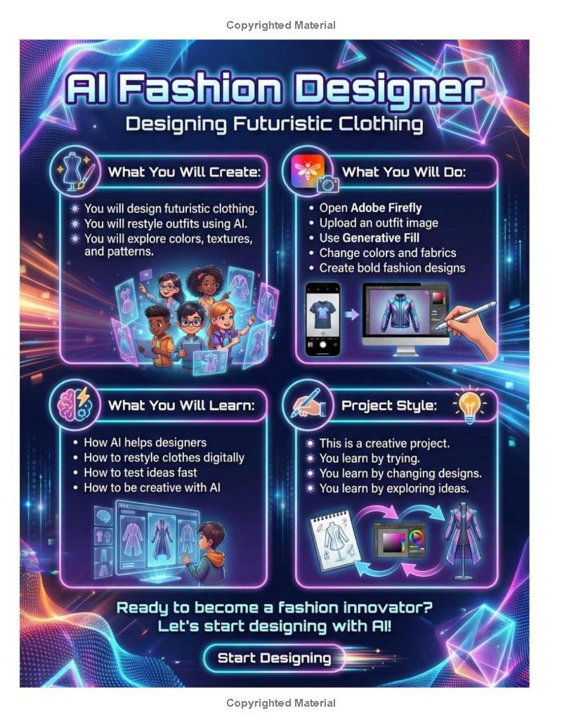 AI Fashion Designer with Adobe Firefly is a hands-on creative guide for children ages 9–12 who want to explore fashion design using artificial intelligence.