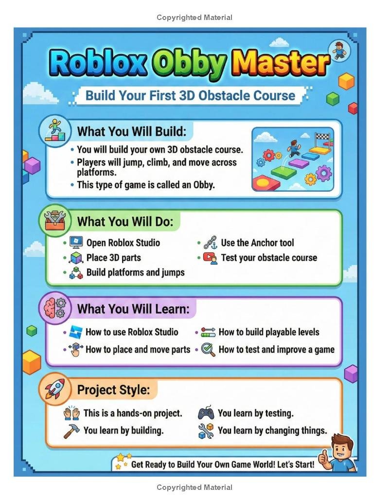 Roblox Obby Master: Build Your First 3D Obstacle Course is a hands-on game creation book designed for children ages 8–12 who want to learn how to build their own Roblox games using Roblox Studio.
